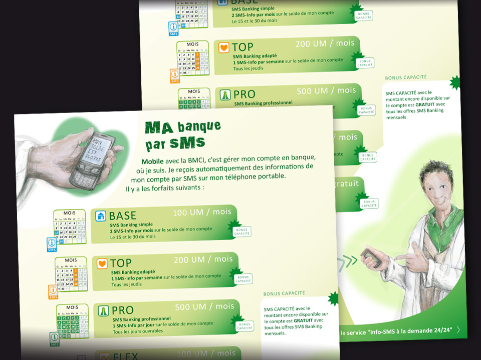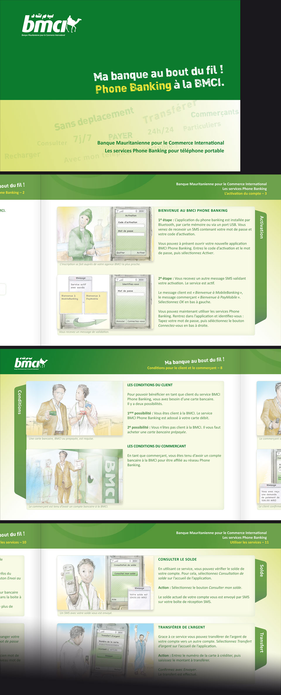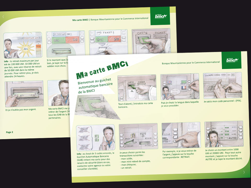 When doing advertising, promoting or informing their customers the Banque Mauretanienne pour le Commerce International is also required to think of slow readers among their customers. This is a common challenge for companies in this part of the world. The bank published a set of richly illustrated brochures, which explain their new cellphone services in a simple way.