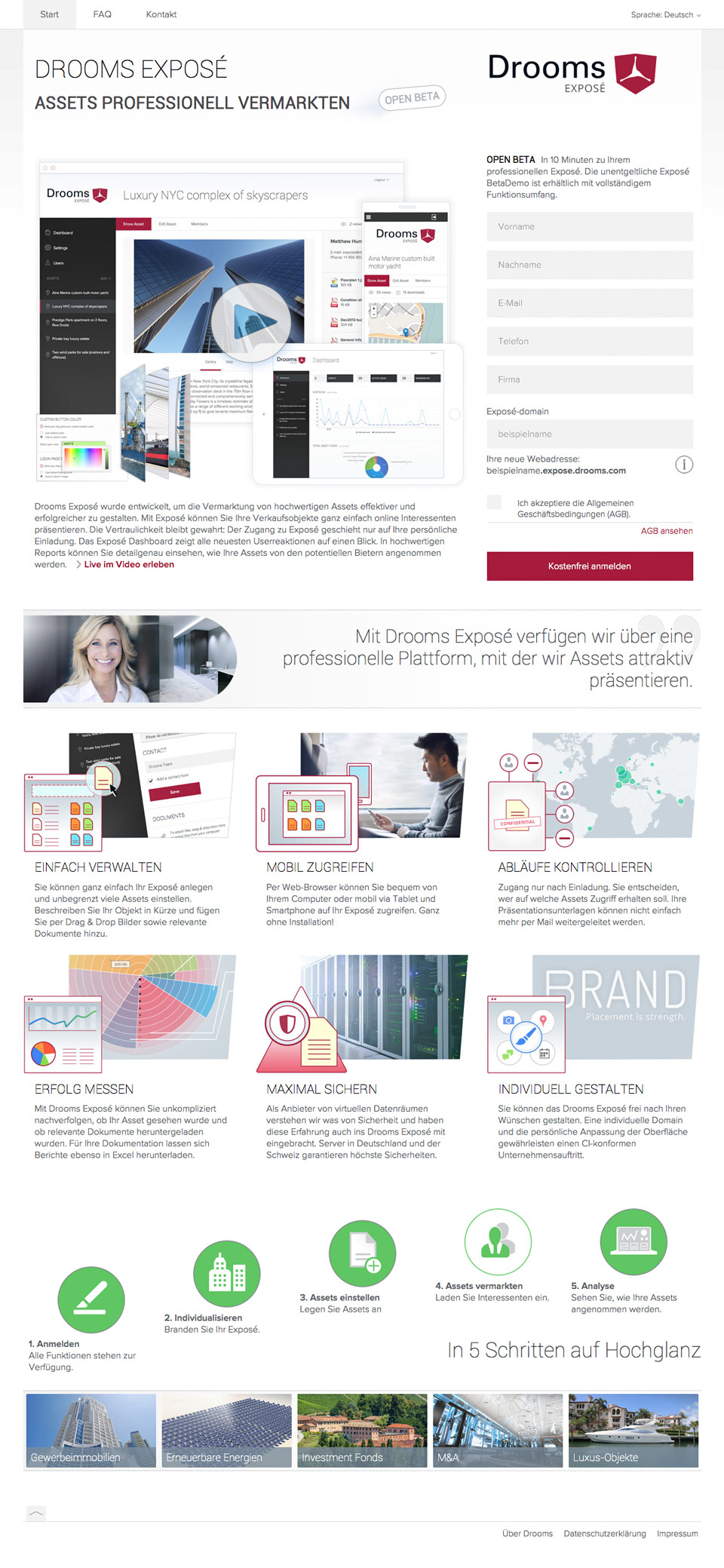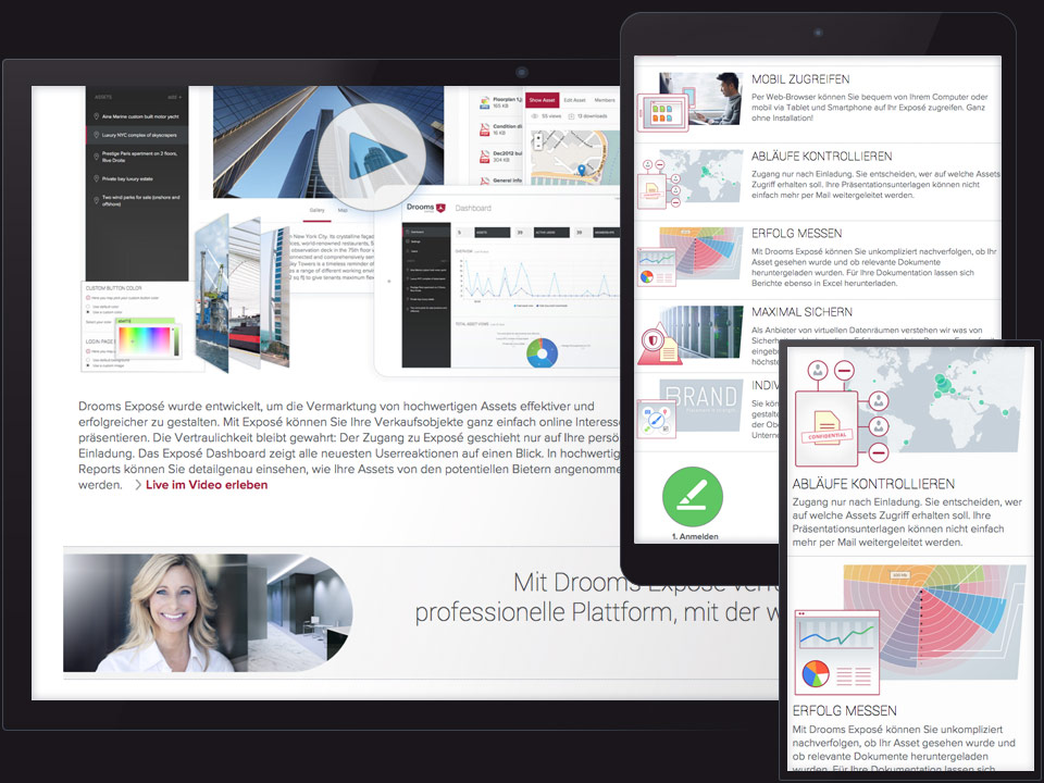 The web application Drooms Exposé facilitates the easy online management of asset showcases sent to potential investors. For the first six months, Exposé was launched as a free beta version in order to gather user feedback. Together with online marketing we planned and structured the microsite. Interested visitors could get acquainted with the features, download the trial version or ask questions. I drew the visual design of the microsite, produced html/css templates and supported the integration of back-end and front-end developers.