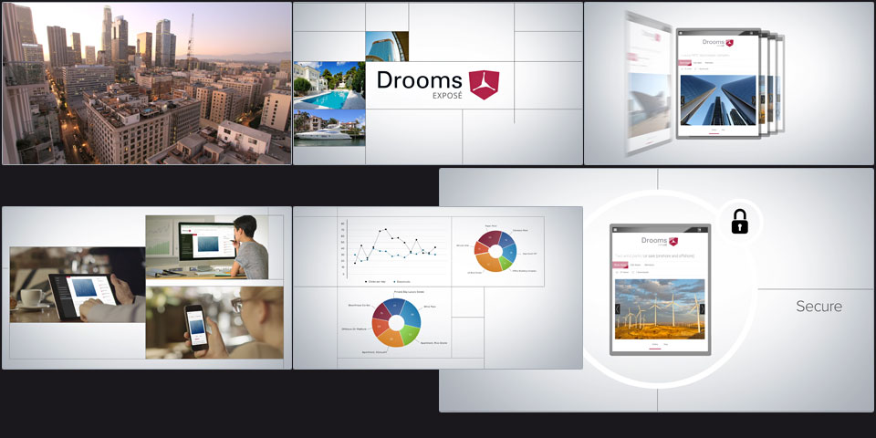 A heterogenic, business orientated target group is used to well-known brands and expects quality. The recently produced Drooms image videos draw the image of a reliable and dynamic software provider. Playing the timeless value of good quality, they establish both Drooms company and the Drooms products as part of an expensive lifestyle. On top of the English versions the videos were dubbed in four more language versions.