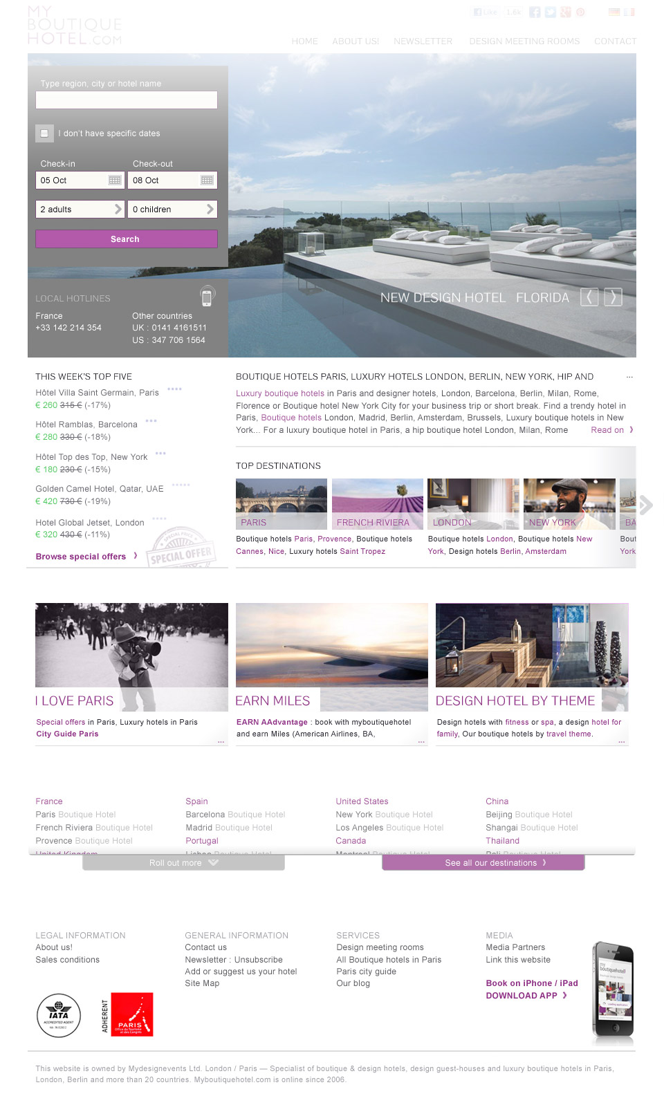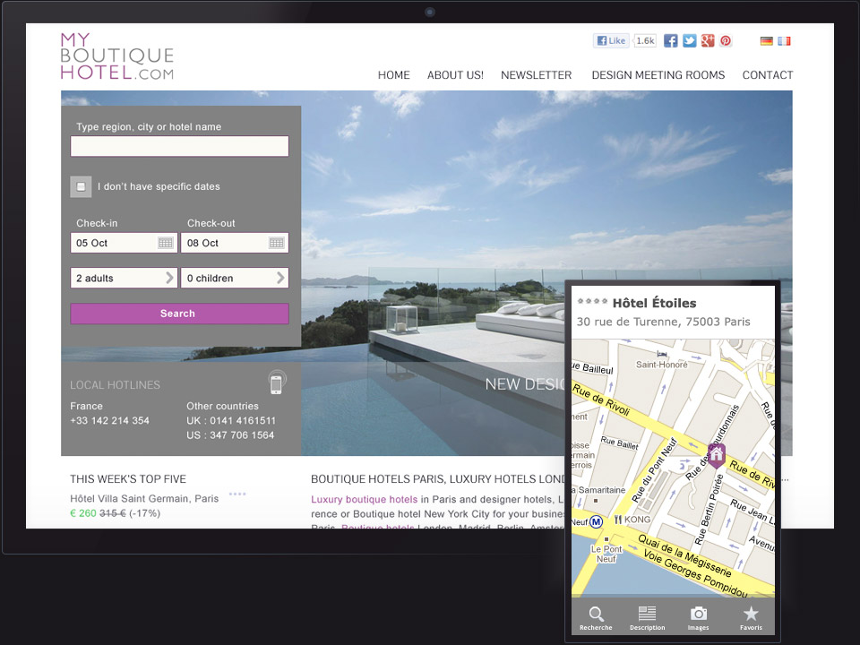 Mydesignevents runs straightforward booking platforms for concept hotels with stunning interiors by famous architects. Starting in 2006, short after its launch, I accompanied the start-up for several years. During that time, I was responsible for conceptualising, drawing and implementing consecutive versions of myboutiquehotel.com and other sites. Mydesignevents could increase the offer of beautiful jetset locations throughout the world. In addition I also created the visual design of two iPad apps.