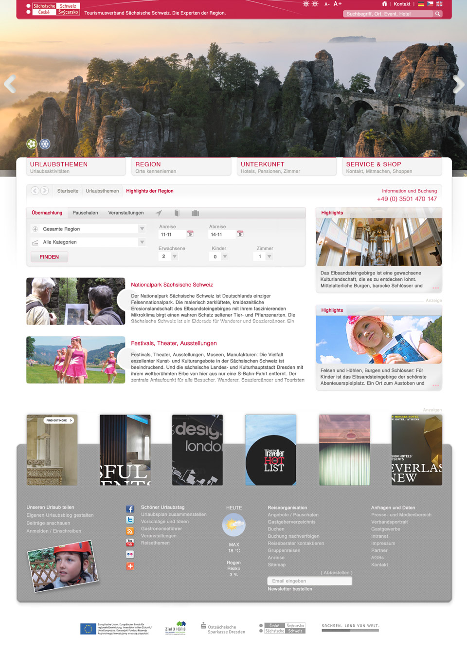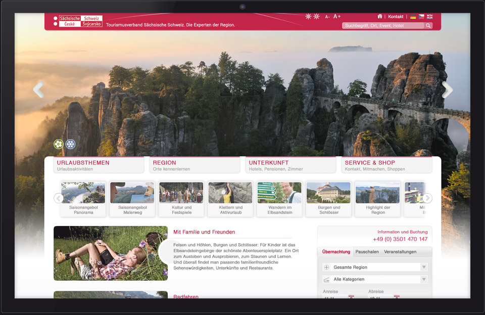 Saxon Switzerland at the German-Czech border is famous for its scenic national park stretching across mountain ridges in the two countries. The portal of the Tourism Association Saxon Switzerland is the central contact point for all travel information and requests in this bilingual region.